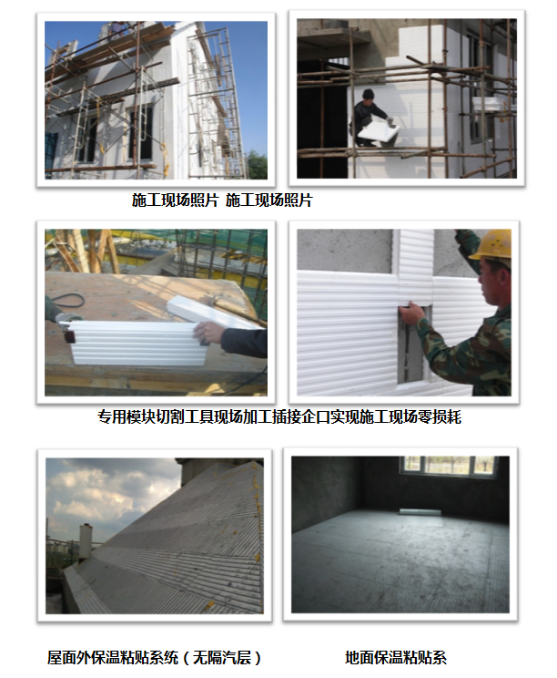 4 粘貼組合出現(xiàn)非整塊時,通過專用切割器按所需要的規(guī)格和形狀現(xiàn)場加工。此舉既有效保證了被切割模塊的幾何尺寸準(zhǔn)確和與原整塊做到企口插接,使模塊組合表面平整,不因有組合縫而降低系統(tǒng)的保溫隔熱性和氣密性并避免了因組合縫隙而造成的“熱橋”。實(shí)現(xiàn)了模塊安裝組合“零損耗”,降低了施工成本,杜絕了施工現(xiàn)場及周邊環(huán)境的“白色污染”。